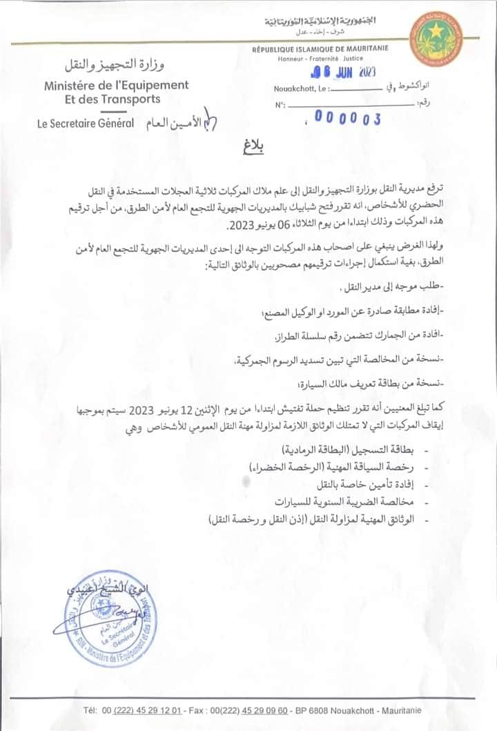 وأكدت وثيقة وزارة التجهيز والنقل أنها ستطلق حملة بداية الأسبوع القادم وستوقف أي مركبة لا تستوفي الوثائق .