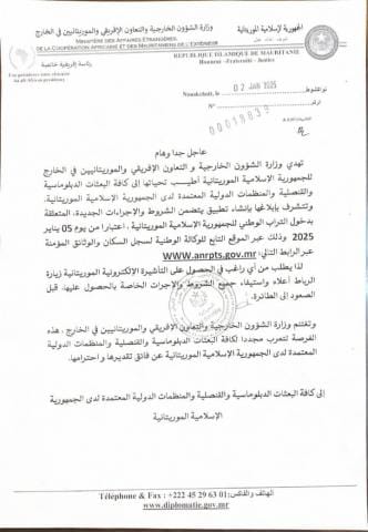 كشفت زارة الشؤون الخارجية و التعاون الإفريقي و الموريتانيين في الخارج في مذكرة موجهة للبعثات الدبلوماسية و القنصلية و المنظمات الدولية العاملة بموريتانيا، رسميا أمس الجمعة عن شروط وإجراءات جديدة للمسافرين الأجانب الراغبين في دخول الأراضي الموريتانية.