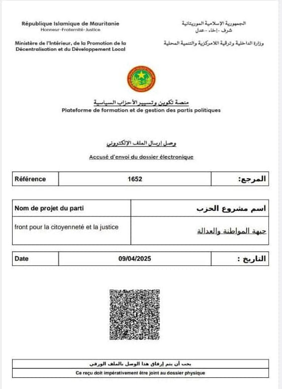 بعد أن تسلمت جبهة المواطنة والعدالة وصلا إلكترونيا لاستيفائها عناصر ملف الترخيص على منصة الأحزاب السياسية التي أعدتها وزارة الداخلية وترقية اللامركزية والتنمية المحلية، قامت اليوم بتسليم نفس الملف ورقيا.