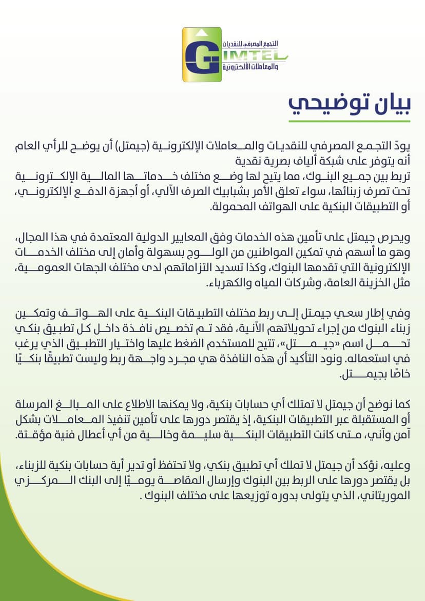وشدد البيان على أن التجمع لا يدير حسابات للزبناء ولا يملك تطبيقا بنكيا، بل يتمثل دوره في الربط بين البنوك وإرسال المقاصة يوميا إلى البنك المركزي الموريتاني الذي يتولى توزيعها على مختلف البنوك.