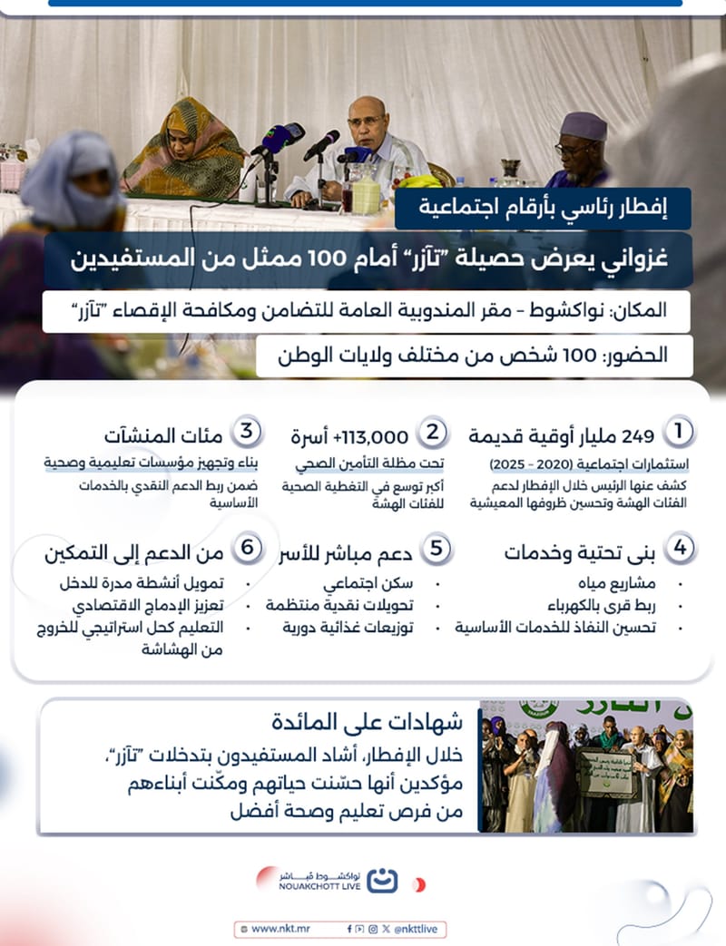 قدّم رئيس الجمهورية، محمد ولد الشيخ الغزواني، خلال إفطار جمعه بمائة من ممثلي مجتمع المندوبية العامة للتضامن الوطني ومكافحة الإقصاء “تآزر”، عرضًا رقميا لحصيلة البرامج الاجتماعية المنفذة بين 2020 و2025، كاشفًا أن حجم الاستثمارات الموجهة لهذا القطاع تجاوز 249 مليار أوقية قديمة.